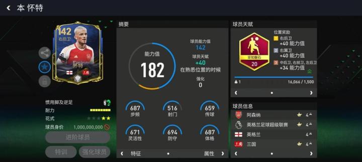 怀特的基础能力值给到了142,是现役边后卫中的顶尖配置。坚如磐石天赋强化了怀特的对抗能力,从数据面板上看,怀特各项防守数据均衡,传球与灵活性也不错,是全能型的边后卫。