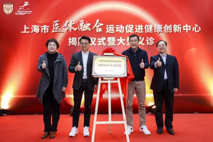 当天,上海申花足球俱乐部运动员创伤治疗定点医院同时揭牌,申花俱乐部董事长谷际庆、主教练吴金贵一起出席。在活动现场,吴金贵特别感谢华山医院运动医学学科带头人、市政府参事陈世益教授,“您给于汉超的治疗、康复展现世界顶级水准,申花的足协杯冠军奖杯,有您一份功劳!”陈世益教授则开玩笑回应,“能不能向吴指导借一下冠军奖杯,在我们上海市医体融合运动促进健康创新中心展览几天……”