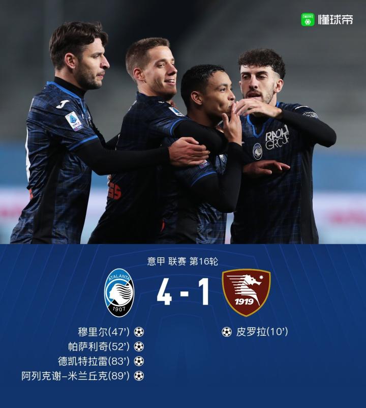 北京时间12月19日意甲 联赛 第16轮,亚特兰大主场对阵萨勒尼塔纳。上半场坎德雷瓦定位球助攻皮罗拉头球破门先拔头筹,比赛下半场穆里尔外围一脚撩射将比分扳平,随后帕萨利奇推射破门迅速完成反超,比赛尾声阶段,斯卡尔维尼前场抢断后助攻德凯特拉雷替补建功,读秒阶段德凯特拉雷也送出一记助攻,米兰丘克成功吃饼将比赛终结,全场战罢,最终比分4-1。