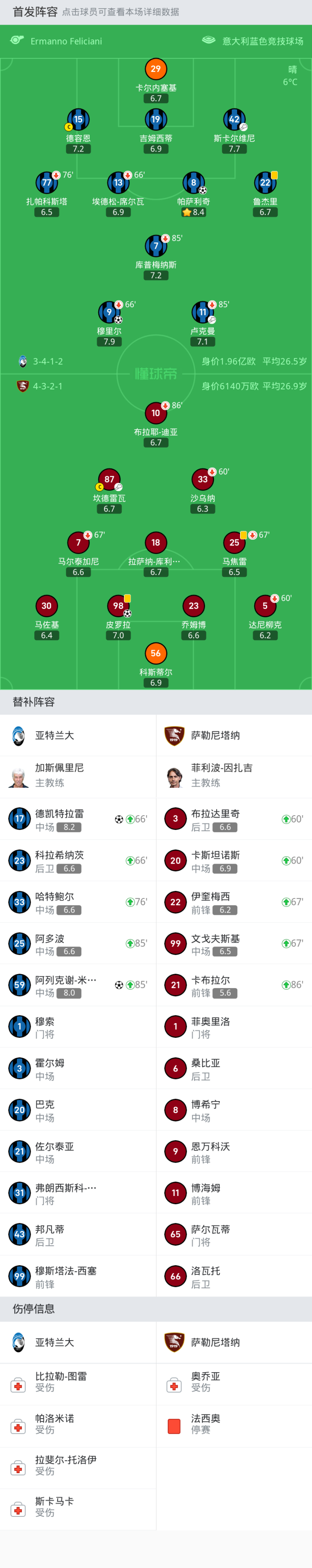 亚特兰大首发:9-穆里尔, 15-德容恩, 19-吉姆西蒂, 77-扎帕科斯塔, 8-帕萨利奇, 7-库普梅纳斯, 11-卢克曼, 29-卡尔内塞基, 13-埃德松-席尔瓦, 22-鲁杰里, 42-斯卡尔维尼