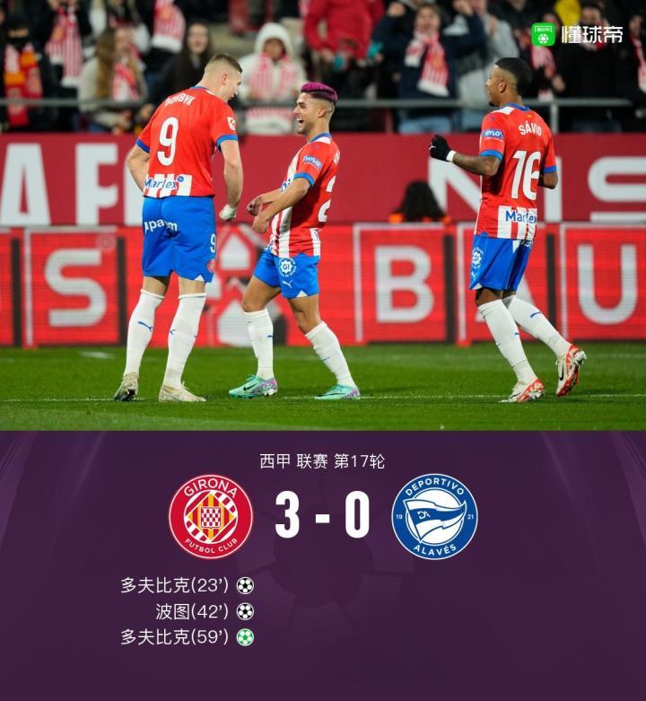 赫罗纳3-0阿拉维斯取四连胜,多夫比克双响,波图破门