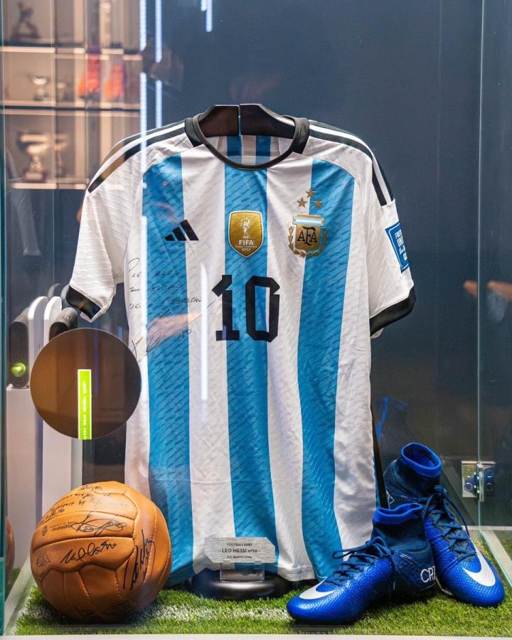 梅西在这件阿根廷球衣正面签名,并写道:“致拉法,充满爱和钦佩。”展出的球衣下面铭牌上写着:“梅西,10号,巴萨俱乐部。”