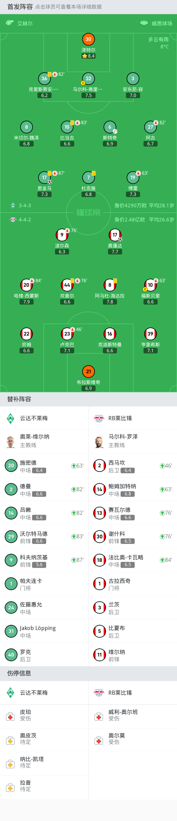 RB莱比锡首发:10-福斯贝里, 21-布拉斯维奇, 44-坎普尔, 9-波尔森, 16-克洛斯特曼, 39-亨里希斯, 22-劳姆, 8-阿马杜-海达拉, 17-奥蓬达, 23-卢克巴, 20-哈维-西蒙斯