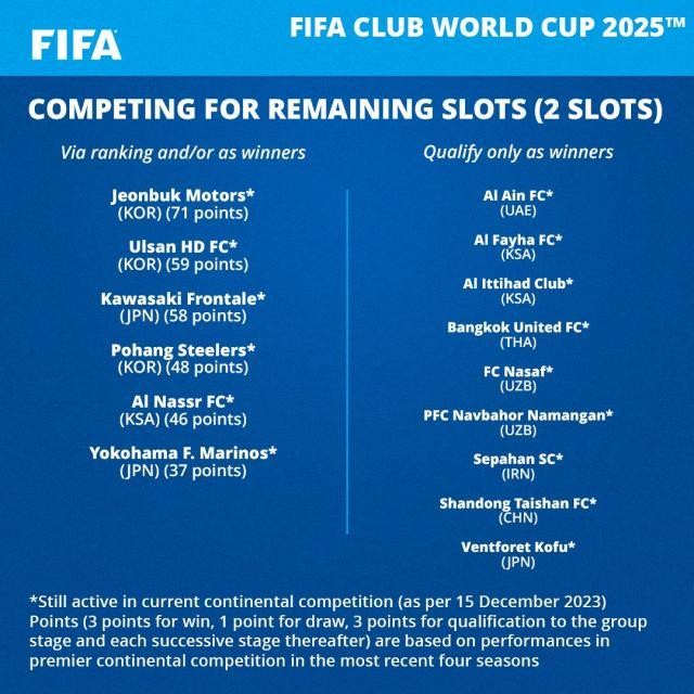 至于第四支参赛队,就将通过第二个途径产生,即以2021年、2022-23赛季、2023-24赛季结束后,这三个赛季亚冠联赛的总成绩换算成技术积分,积分最高的球队将获得参赛资格。