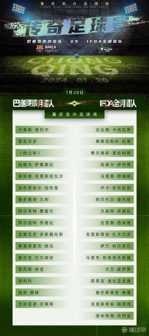 你会去看吗?传奇足球赛中国重庆站正式官宣,巴塞罗那明星队VSIFDA全明星队,比赛时间是2024年01月20日19:00,在重庆龙兴足球场进行。 官方宣布阵容中,两队阵容星光熠熠,普约尔、里瓦尔多、萨维奥拉、久利、卡纳瓦罗、萨内蒂、托蒂、莫伦特斯等传奇球星云集。票价档次分为288元、488元、688元、888元、1088元、1288元六个档次。 龙兴足球场是重庆首座专业足球场,可容纳约6万人观赛。
