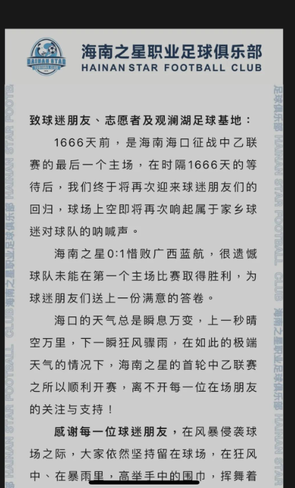 在海南之星,她最懂如何架起球队与球迷之间的桥梁。首战暴雨来袭,志愿者们无怨无悔地面对突发情况,球迷们雨中对球队不离不弃的支持,容蓉看在眼里。因此,比赛结束后,容蓉以俱乐部的名义在公众号上发布了一封感谢信。
