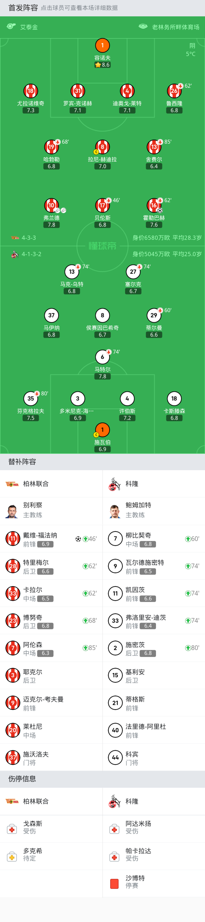 柏林联合首发:10-弗兰德, 31-罗宾-克诺赫, 26-鲁西隆, 1-容诺夫, 8-拉尼-赫迪拉, 17-贝伦斯, 19-哈勃勒, 18-尤拉诺维奇, 13-舍费尔, 4-迪奥戈-莱特, 16-霍勒巴赫