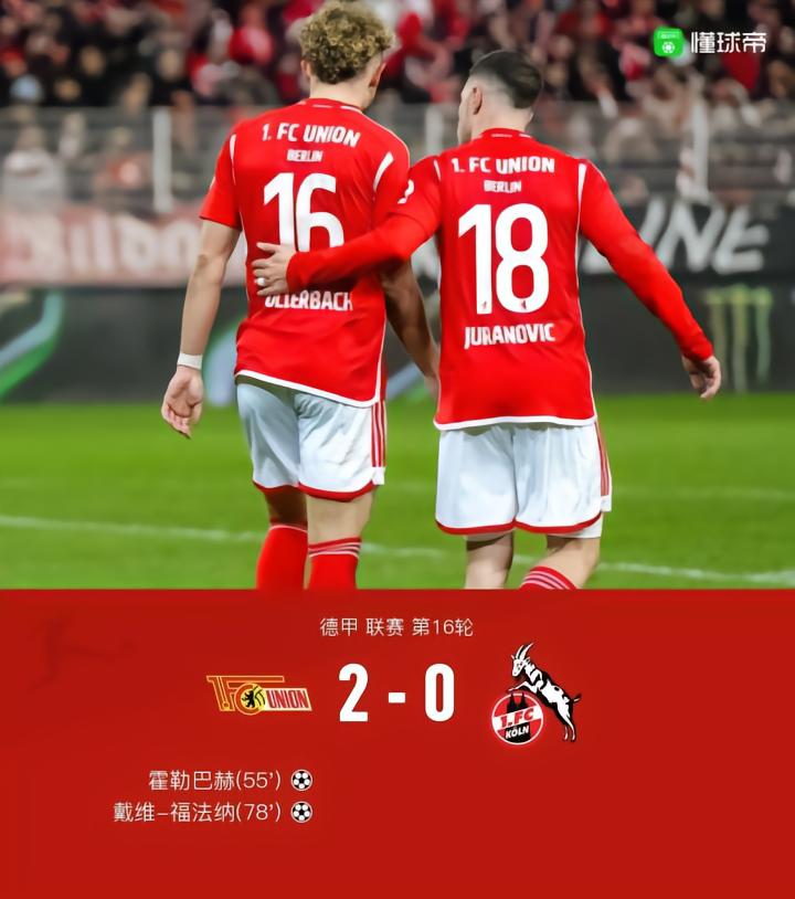 柏林联合2-0科隆,霍勒巴赫、福法纳破门,弗兰德助攻双响