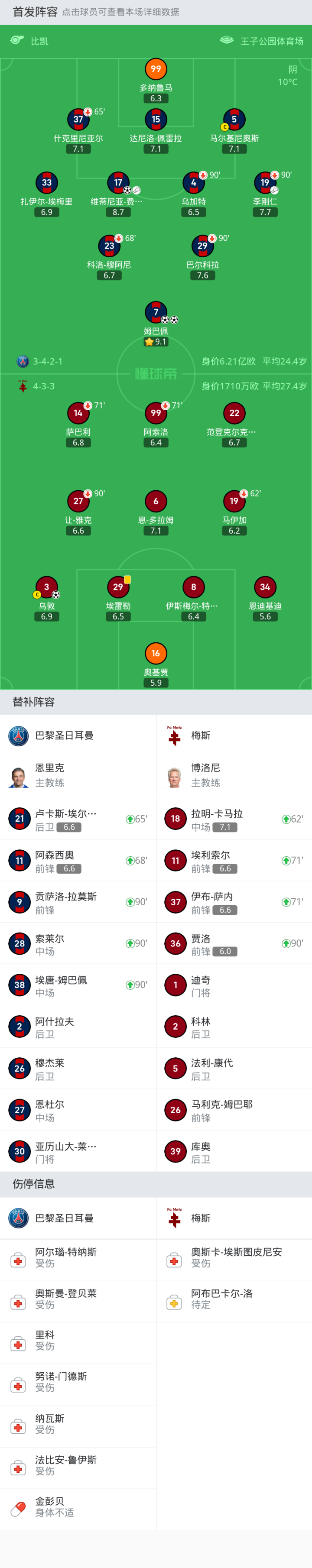 上场替补:65'21-卢卡斯-埃尔南德斯, 68'11-阿森西奥, 90'+128-索莱尔, 90'+29-贡萨洛-拉莫斯, 90'+238-埃唐-姆巴佩