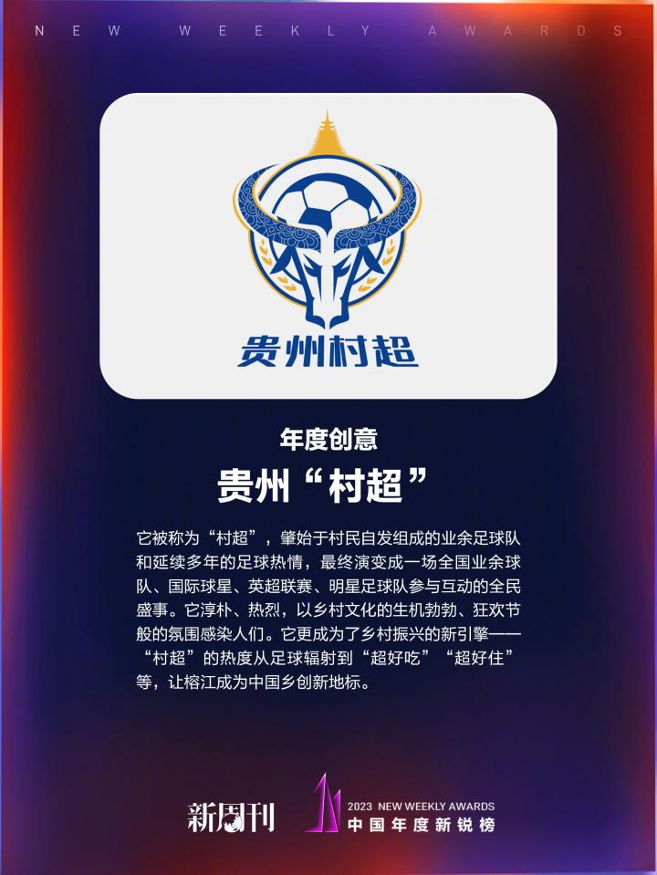 新周刊中国年度新锐榜:贵州村超获得年度创意荣誉ZeroTsu_02 @懂球帝2023-12-21 15:29新周刊评选的中国年度新锐榜,贵州村超获得了年度创意荣誉。新周刊评价道:它被称为“村超”,肇始于村民自发组成的业余足球队和延续多年的足球热情,最终演变成一场全国业余球队、国际球星、英超联赛、明星足球队参与互动的全民盛事。它淳朴、热烈,以乡村文化的生机勃勃、狂欢节般的氛围感染人们。它更成为了乡村振兴的新引擎—“村超”的热度从足球辐射到“超好吃”“超好住”等,让榕江成为中国乡创新地标。展开更多