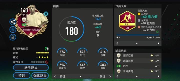 此前的世界杯活动中,卡洛斯推出的这张140能力值球员卡令众多玩家记忆犹新,配备角斗士天赋后,他在攻守两端的关键数据都有一定提升。实战中,卡洛斯的速度极快,由守转攻时会高速前插,从边路给对手施加压迫。在前场,卡洛斯的传中落点精准,内切之后,他的爆射打门同样犀利,是一名能突能射的进攻型边后卫。