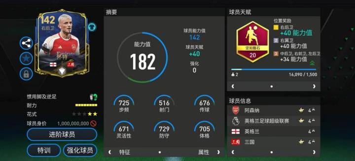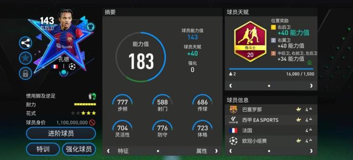 欧冠小组赛活动中,孔德推出的这张基础能力值143的欧洲之星版本可谓颜值与实力兼备,天赋方面,角斗士的配置也让他攻守两端的关键数据都有提升。实战中,孔德的边路卡位防守硬朗,应对对手的内切突破,孔德表现相当靠谱。进攻端,孔德具备流畅的盘带突破,前插之后,他的传中球落点精准,助攻能力相当不错。