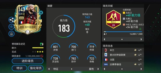 此前的赛季最佳活动中,特奥-埃尔南德斯凭借出色的表现推出了一张基础能力值143的赛季最佳终极版本,配备角斗士天赋,实战表现同样不俗。实战中,特奥的持球稳定性更加出色,他的抗干扰能力极佳,具备从后场一条龙的带球突破能力。另外,特奥推进到前场后,他的边路传中和内切打门也都能制造一定威胁,压迫性极强。