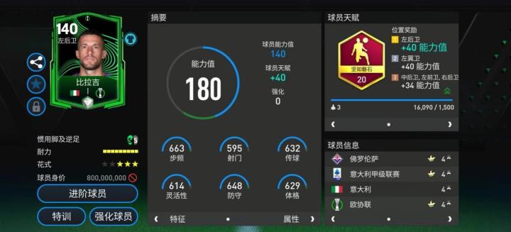 欧冠小组赛活动中,比拉吉推出的这张基础能力值140的欧协联球员卡备受瞩目。天赋方面他配备了坚如磐石,这让他的对抗能力以及防守表现都有一定提升。实战中,比拉吉的速度一般,但是正面冲抢断球成功率高。一对一防守时,比拉吉的跟防效果出色,会始终保持自己稳定的防守站位,让对手持球进攻球员难以突破。