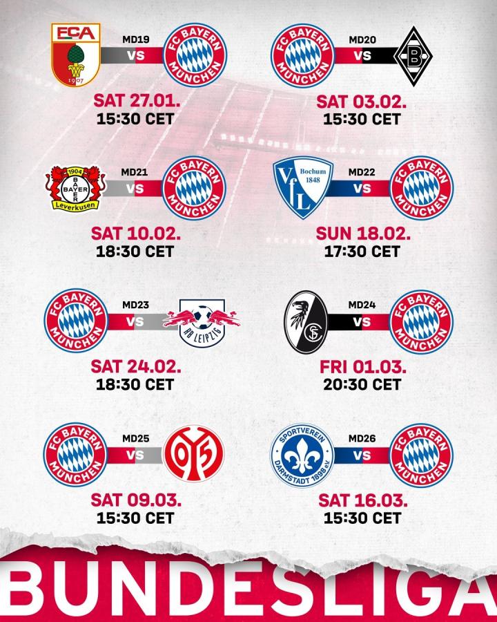 北京时间12月21日晚,德甲官方公布了第19-第26轮的赛程。其中,拜仁将在分别在北京时间2月11日(大年初二)与2月25日的1:30对阵勒沃库森与RB莱比锡。