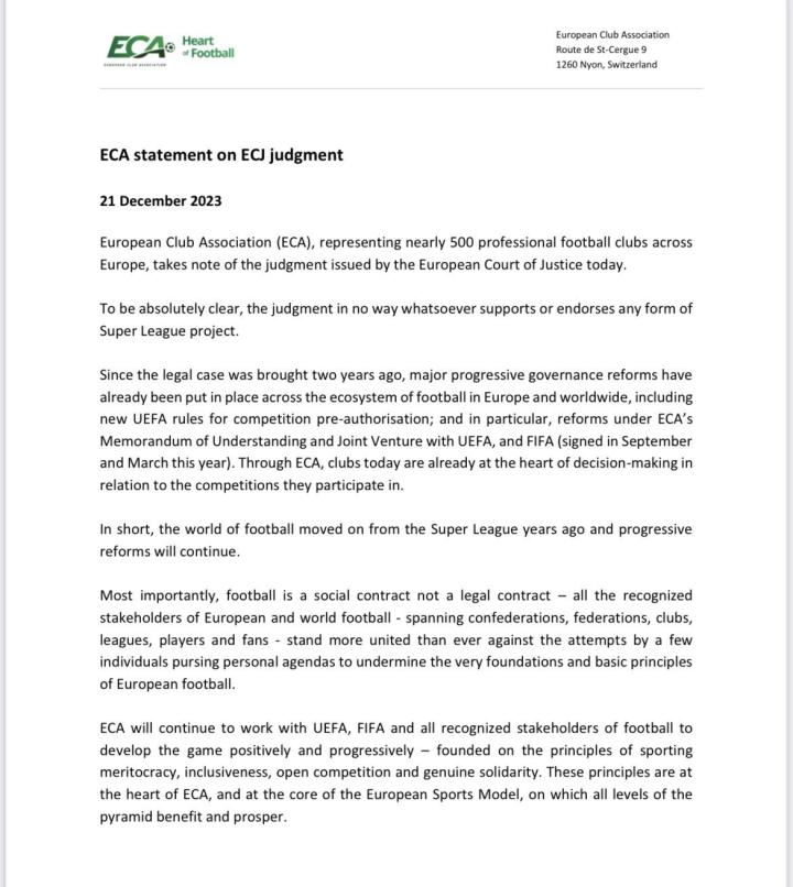 2023年12月21日,代表欧洲近500个职业足球俱乐部的欧洲足球俱乐部协会 (ECA) 注意到欧盟法院今天发布的判决。需要明确的是,该判决绝不代表支持或认可任何形式的欧超项目。