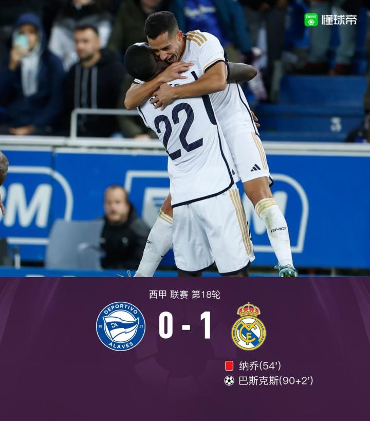 北京时间12月22日西甲 联赛 第18轮,阿拉维斯主场对阵皇家马德里。上半场开场不久巴尔韦德禁区打门被扑,随后巴尔韦德远射造险,下半场纳乔踩踏染红,巴斯克斯头球绝杀,最终皇马客场1-0险胜阿拉维斯。