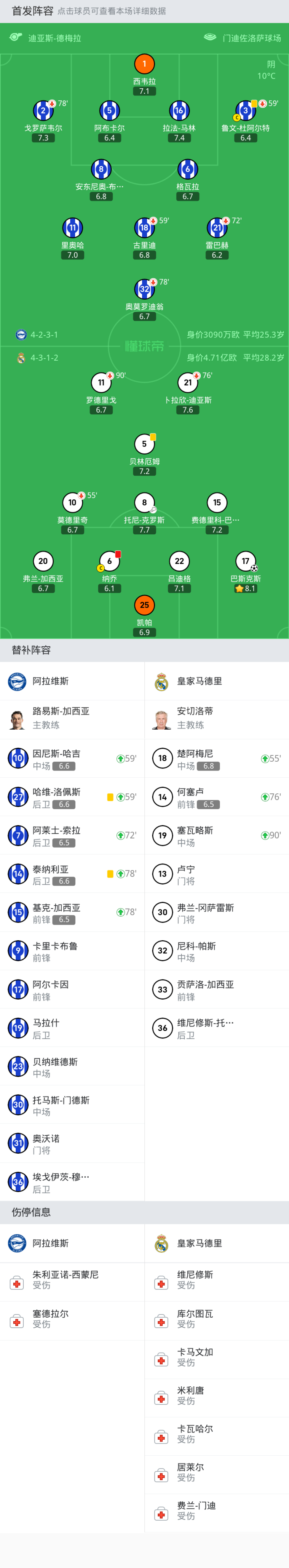 阿拉维斯首发:3-鲁文-杜阿尔特, 11-里奥哈, 2-戈罗萨韦尔, 18-古里迪, 1-西韦拉, 6-格瓦拉, 8-安东尼奥-布兰科, 5-阿布卡尔, 16-拉法-马林, 21-雷巴赫, 32-奥莫罗迪翁