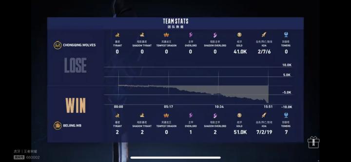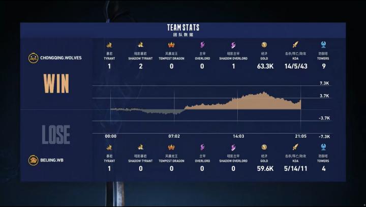 之后的比赛狼队凭借优势一直入侵,双方人头交换较少,重庆狼队控龙+资源,经济领先4k!