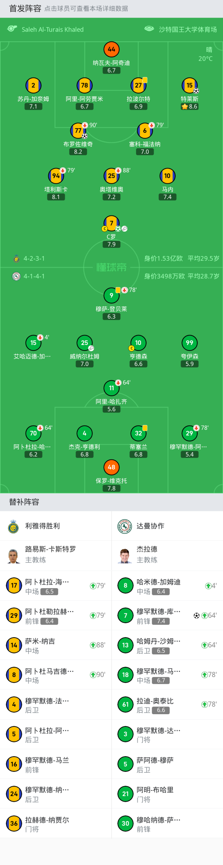 利雅得胜利首发:7-C罗, 15-特莱斯, 77-布罗佐维奇, 27-拉波尔特, 10-马内, 6-塞科-福法纳, 25-奥塔维奥, 94-塔利斯卡, 2-苏丹-加奈姆, 78-阿里-阿劳贾米, 44-纳瓦夫-阿奇迪