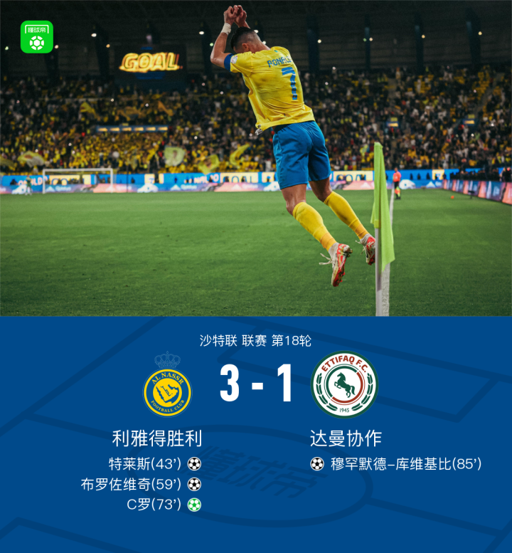 第59分钟,达曼协作后场失误,C罗助攻布罗佐维奇收获联赛首球,利雅得胜利2-0达曼协作