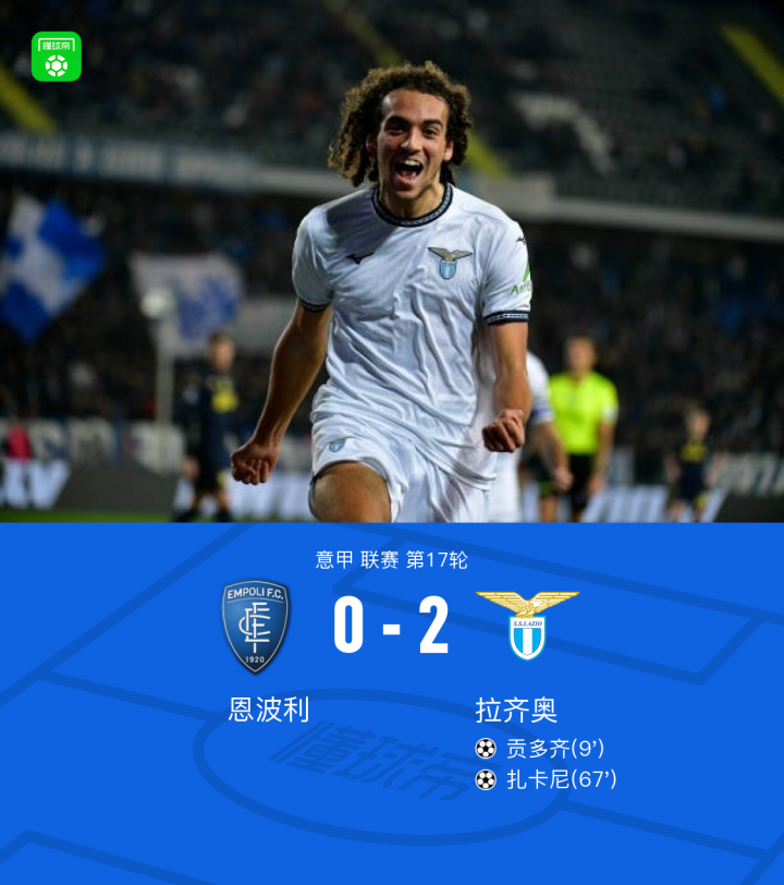 拉齐奥2-0客胜恩波利,贡多齐破门,因莫比莱、阿尔贝托伤退