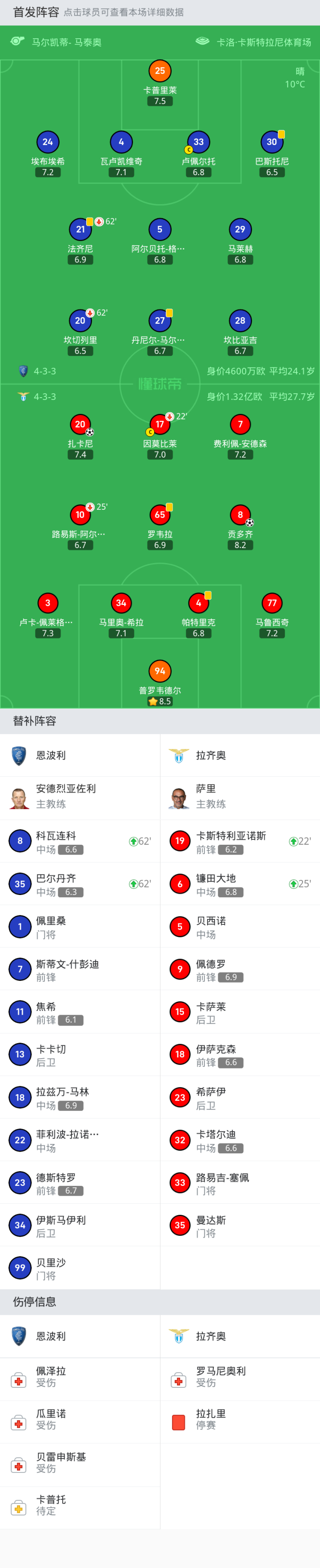 恩波利首发:5-阿尔贝托-格拉西, 33-卢佩尔托, 30-巴斯托尼, 24-埃布埃希, 29-马莱赫, 4-瓦卢凯维奇, 25-卡普里莱, 20-坎切列里, 28-坎比亚吉, 27-丹尼尔-马尔蒂尼, 21-法齐尼