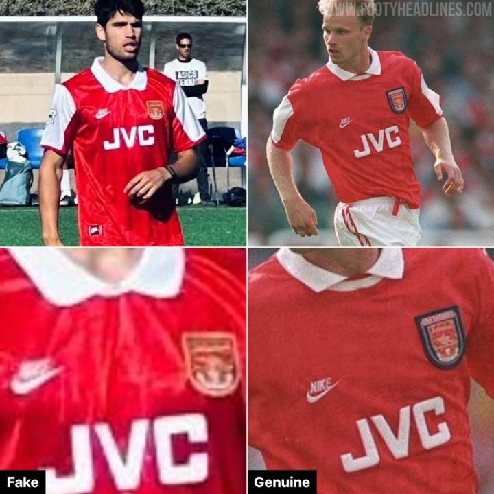 阿尔卡拉兹所穿的耐克阿森纳1994-96赛季球衣背面印有博格坎普的名字,由于衣领(参见上图的白色条纹,在原球衣上有一个缺口)和徽章与原来的球衣明显不同。