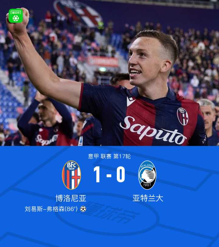博洛尼亚1-0亚特兰大取各项赛事4连胜,刘易斯-弗格森绝杀