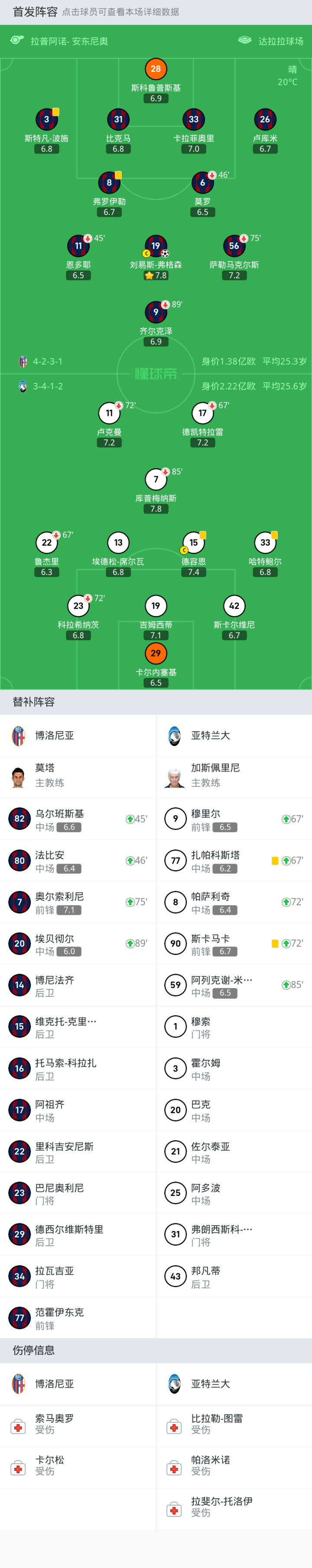 亚特兰大首发:15-德容恩, 19-吉姆西蒂, 23-科拉希纳茨, 33-哈特鲍尔, 7-库普梅纳斯, 11-卢克曼, 29-卡尔内塞基, 13-埃德松-席尔瓦, 17-德凯特拉雷, 22-鲁杰里, 42-斯卡尔维尼