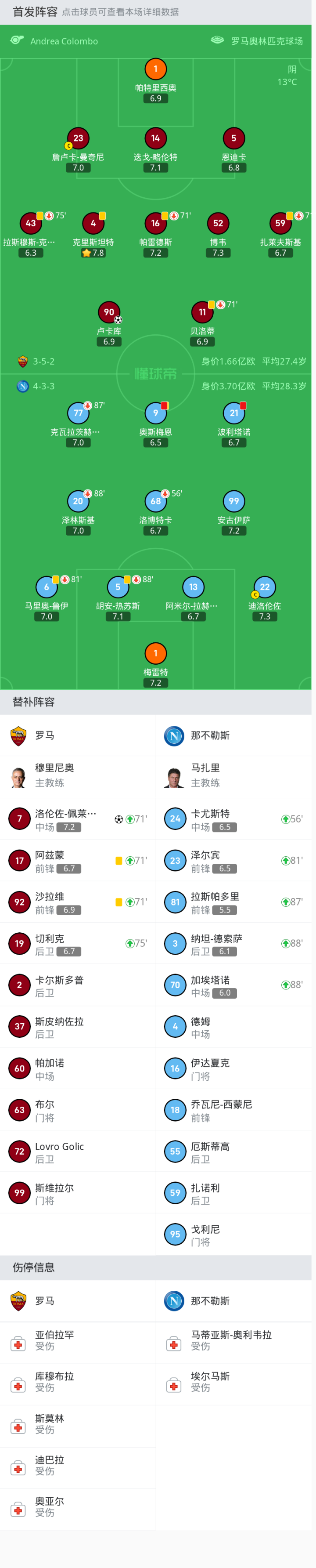 替换下场:88'5-胡安-热苏斯, 81'6-马里奥-鲁伊, 88'20-泽林斯基, 56'68-洛博特卡, 87'77-克瓦拉茨赫利亚