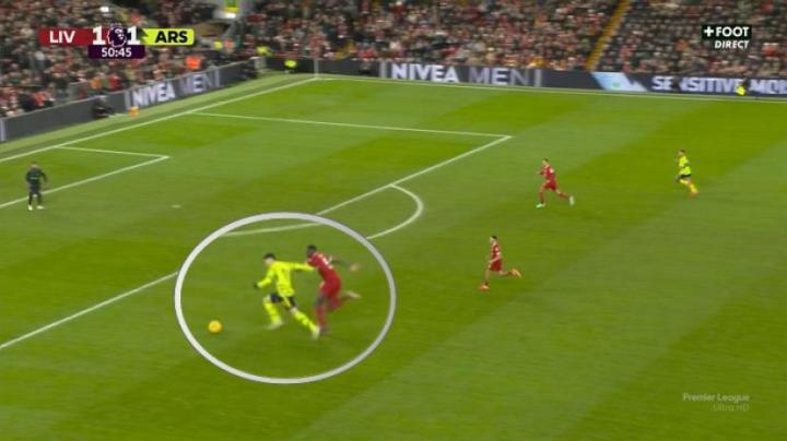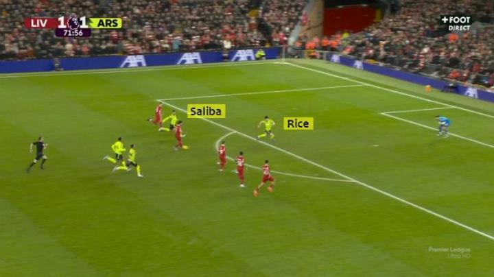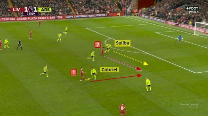 在一对二的比赛中,萨利巴试图减缓萨拉赫的决策速度,同时法国人判断到了萨拉赫的两种进攻方式——自己左脚射门,或者传给加克波。他良好的站位和方向感,将使赖斯能够回来拦截萨拉赫最终选择的传球。