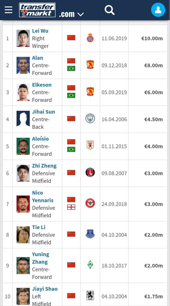 中国球员历史德转最高身价排行小星星啦 @懂球帝2023-12-24 18:29中国球员历史德转最高身价排行: 1.武磊:1000万欧 2.阿兰:800万欧 3.艾克森:600万欧 4.孙继海:450万欧 5.洛国富:400万欧 6.郑智:300万欧 7.李可:300万欧 8.李铁:200万欧 9.张玉宁:200万欧 10.邵佳一:175万欧 注:德转规则未入选国家队大名单的归化球员不包含在内。展开更多