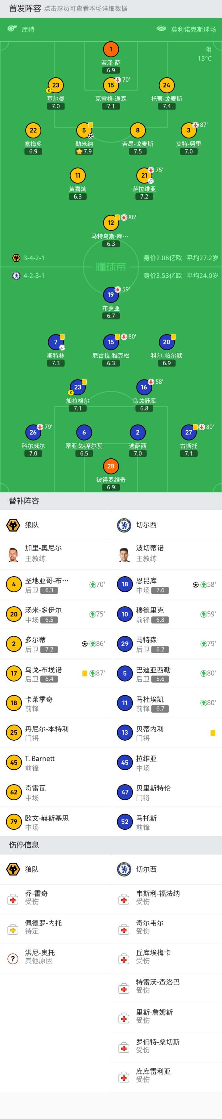 狼队首发:15-克雷格-道森, 21-萨拉维亚, 5-勒米纳, 22-塞梅多, 1-若泽-萨, 11-黄喜灿, 23-基尔曼, 12-马特乌斯-库尼亚, 3-艾特-努里, 24-托蒂-戈麦斯, 8-若昂-戈麦斯