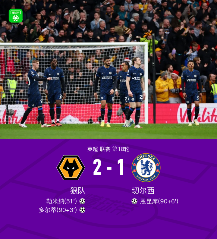 北京时间12月24日英超联赛第18轮,狼队主场对阵切尔西。比赛第51分钟,勒米纳头槌建功,补时第3分钟,多尔蒂接巴迪亚西勒失误助攻再下一城,补时第6分钟,恩昆库头球打进切尔西生涯首球。最终比分狼队2-1切尔西。