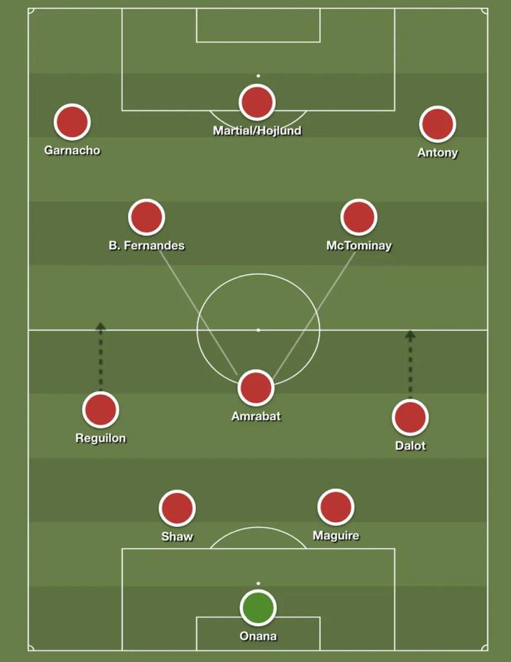 在无球状态下,麦克托米奈会和阿姆拉巴特或梅努搭档中场,曼联的4-2-3-1阵型也可以暂时变为4-4-2。