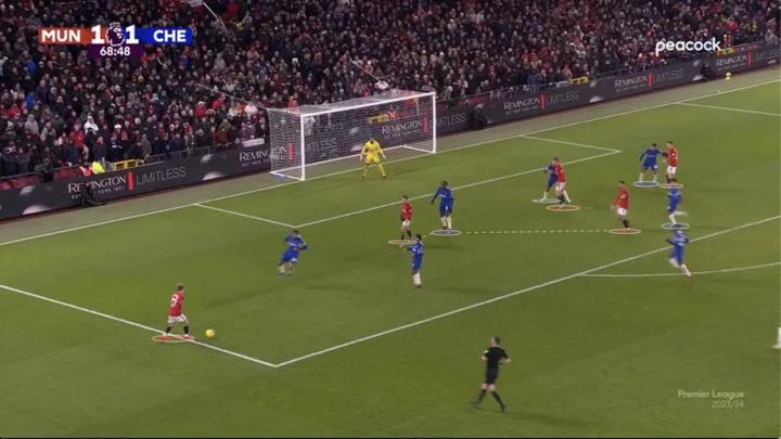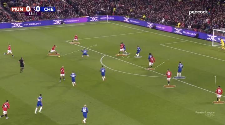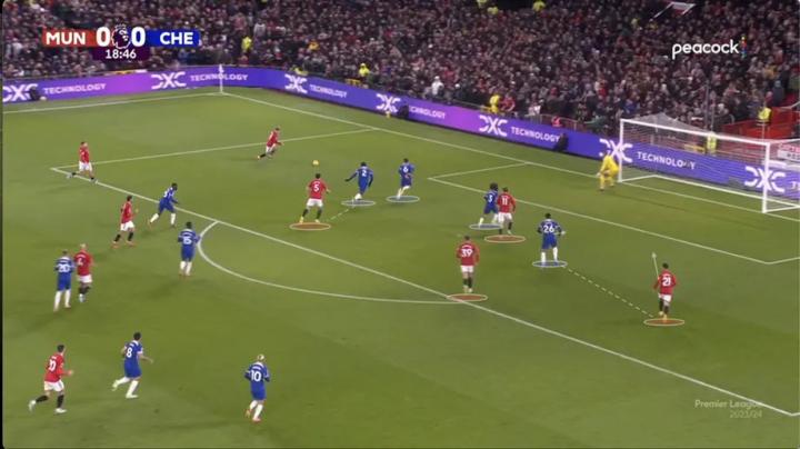 这次进攻始于布鲁诺在禁区前得球。曼联这边的马奎尔和霍伊伦在禁区中路吸引了切尔西防线的注意力,另外远端的安东尼也处于无人看管的状态。