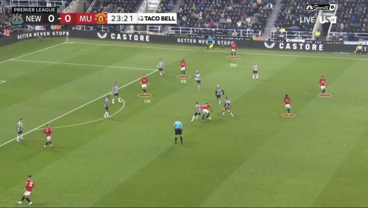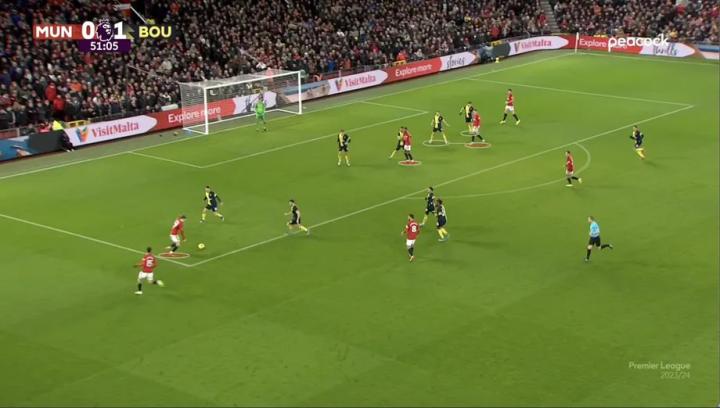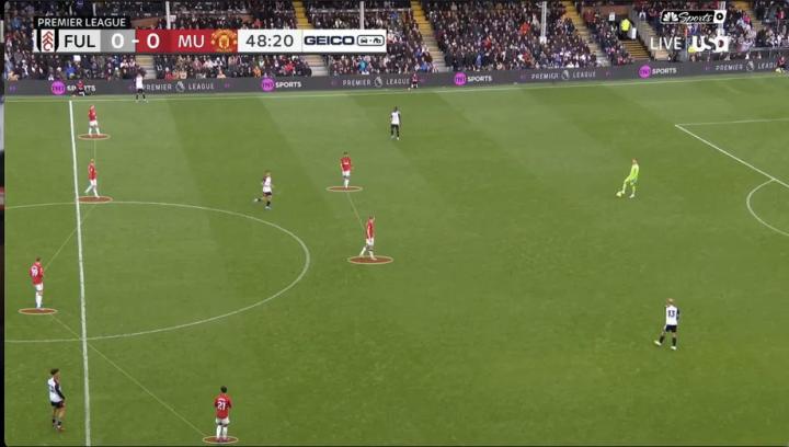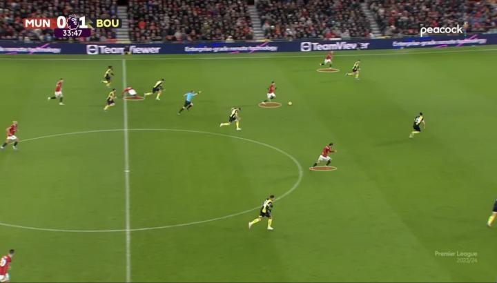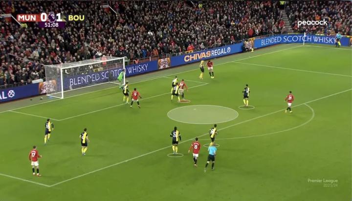 布鲁诺直塞传给加纳乔,给马奎尔和霍伊伦创造出跑动空间。由于霍伊伦启动抢点,库库雷利亚不得不跟防。安东尼也迫使科尔维尔必须做出反应。