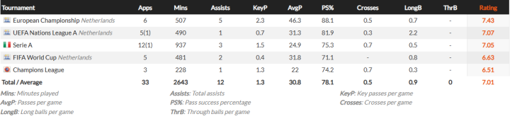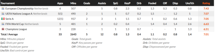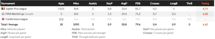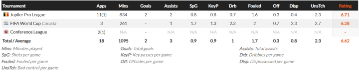 进攻端的数据:2球3助攻,射门1次/场,关键传球1.5次/场,带球过人0.7次/场,犯规1次/场,越位0.2次/场,尝试过人时被断球0.6次/场,控球失误1.3次/场。