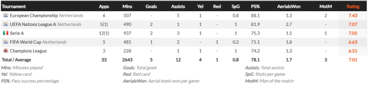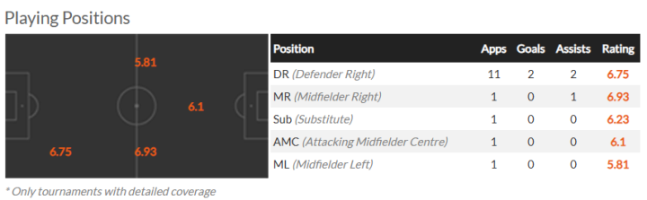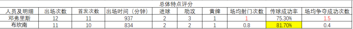 12次出场11次首发,937分钟,2球3助攻,射门1次/场,传球成功率75.3%,争顶1.5次/场。