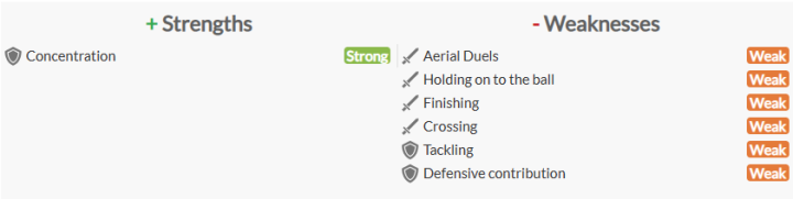 进攻端的数据:2球2助攻,射门0.8次/场,关键传球0.8次/场,带球过人0.7次/场,犯规1.6次/场,越位0.3次/场,尝试过人时被断球0.4次/场,控球失误2.3次/场。