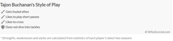 布坎南在联赛中出场11次,10次首发,出场时间为834分钟,2球2助攻,1张黄牌,射门0.8次/场,传球成功率81.7%,争顶成功数0.4次/场,平均得分6.71。