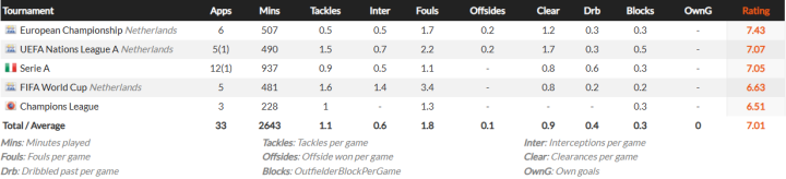 防守端的数据:铲球0.9次/场,拦截0.5次/场,犯规1.1次/场,解围0.8次/场,带球过人0.6次/场,禁区外拦截0.3次/场。