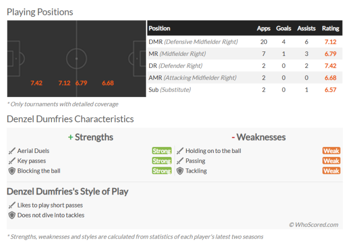 邓弗里斯的特点是喜欢短传,很少铲球,优点是争顶,关键传球,拦截,缺点是不擅长持球,传中和铲球。