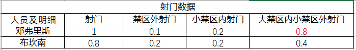 射门数据:射门0.8次/场,禁区外射门0.2次/场,小禁区内射门0.2次/场,大禁区内小禁区外射门0.4次/场。