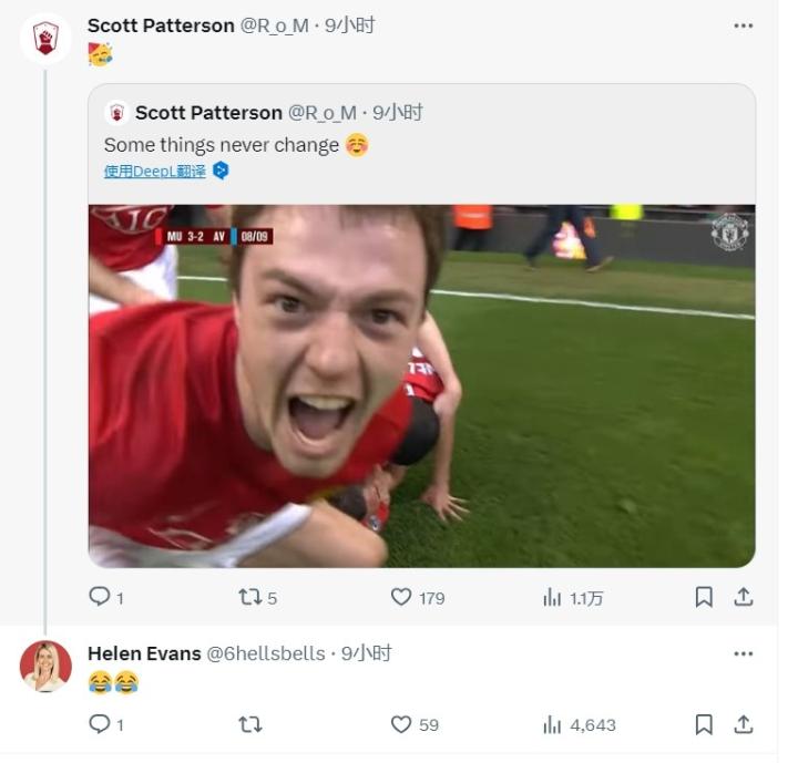 2009年4月,曼联著名博主斯科特-帕特森用一张埃文斯庆祝马切达在老特拉福德绝杀维拉的照片回复了埃文斯的妻子。如今,曼联再次绝杀维拉,斯科特-帕特森转发了这则老帖,海伦-埃文斯也回复了笑哭的表情回应。