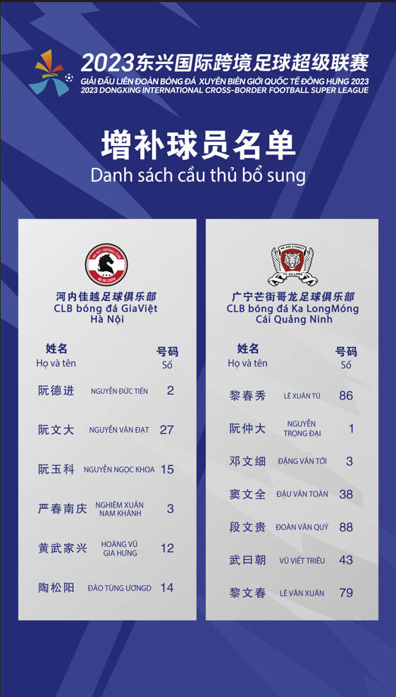 耀武酒肆工作室12月29日,跨超联赛决赛和季军战的增补名单出炉,决赛广西蓝航VS芒街哥龙,芒街哥龙增补7名前越南国字号球员,剑指冠军。另外季军战东兴国门丰润VS河内佳越,河内佳越也增补了多名强援。