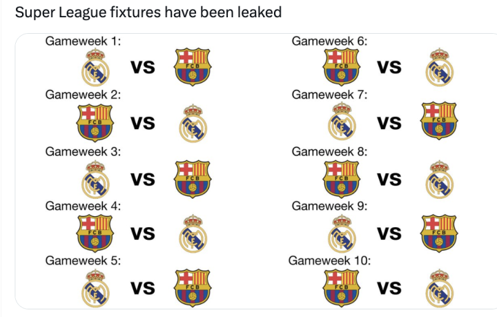 根据现有情况,仅巴萨皇马两家俱乐部公开支持欧超联赛,甚至有球迷排出了「20周,周周国家德比」的离谱赛程。