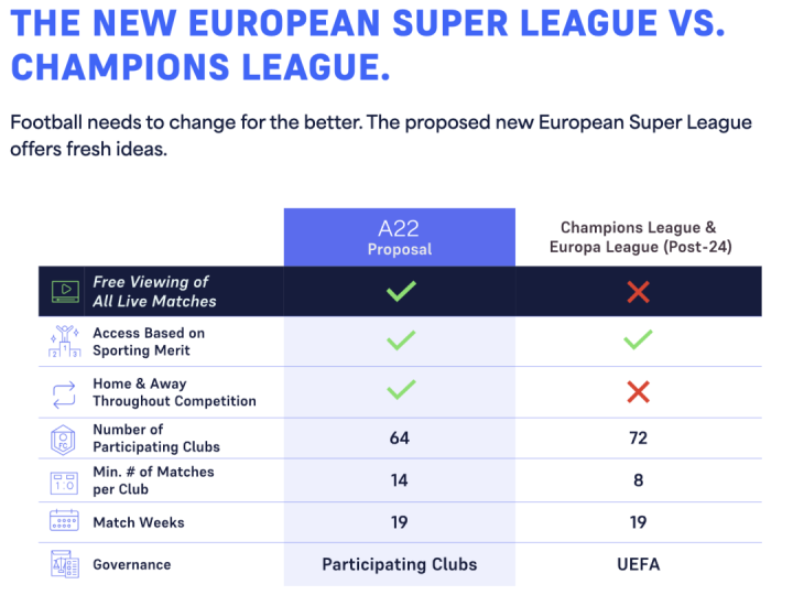 与15支球队拥有永久参赛席位的原欧超相比,新欧超让更多球队可以参与,此外,非封闭联赛也意味着欧超的一部分妥协。