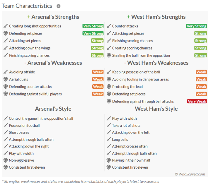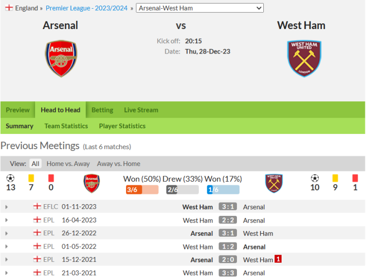 阿森纳主场对阵西汉姆联的战绩非常好,在过去13场英超主场比赛中赢了12场,除了2015-16赛季首回合以0-2落败。西汉姆联在2006年2月至2007年4月期间连续三次击败阿森纳,但在此后的30场比赛中,他们只赢了两场。西汉姆联在英超联赛中输掉的比赛没有一场比对阵阿森纳(35场,与对阵利物浦相同)更多,而阿森纳在对阵埃弗顿的比赛中赢了37场。阿森纳在去年节礼日以3-1赢得了这场比赛, 4月,当枪手对曼城的英超冠军挑战受挫时,他们在伦敦体育场以2-2战平对手。不过,西汉姆联赢得了他们之间最近的一场比赛,在上个月的联赛杯第四轮比赛中以3-1击败了阿森纳,明星中场赖斯首次对阵他的前东家。